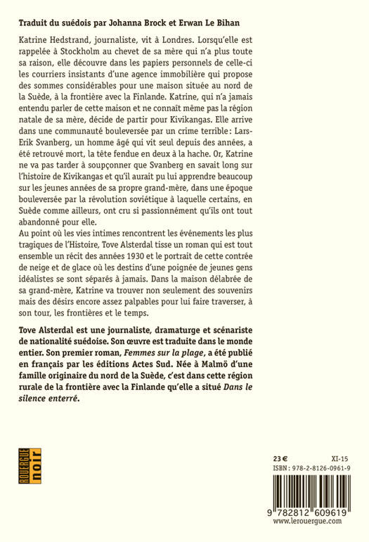 Katrine Hedstrand, journaliste, vit à Londres. Lorsqu'elle est rappelée à Stockholm au chevet de sa mère qui n'a plus toute sa raison, elle découvre dans les papiers personnels de celle-ci les courriers insistants d'une agence immobilière qui propose des sommes considérables pour une maison située au nord de la Suède, à la frontière avec la Finlande. Katrine, qui n'a jamais entendu parler de cette maison et ne connaît pas même la région natale de sa mère, décide de partir pour Kivikangas. Elle arrive dans une communauté bouleversée par la découverte d'un crime terrible : Lars-Erik Svanberg, un homme âgé qui vit seul depuis des années, a été retrouvé mort, la tête fendue en deux à la hache. Or, Katrine ne va pas tarder à soupçonner que Svanberg en savait long sur l'histoire de Kivikangas et qu'il aurait pu lui apprendre beaucoup sur les jeunes années de sa propre grand-mère, dans une époque bouleversée par la révolution soviétique à laquelle certains, en Suède comme ailleurs, ont cru si passionnément qu'ils ont tout abandonné pour elle. Au point où les vies intimes rencontrent les événements les plus tragiques de l'Histoire, Tove Alsterdal tisse un roman qui est tout ensemble un récit des années 1930 et le portrait de cette contrée de neige et de glace où les destins d'une poignée de jeunes gens idéalistes se sont séparés à jamais. Dans la maison délabrée de sa grand-mère, Katrine va trouver non seulement des souvenirs mais des désirs encore assez palpables pour lui faire traverser, à son tour, les frontières et le temps.