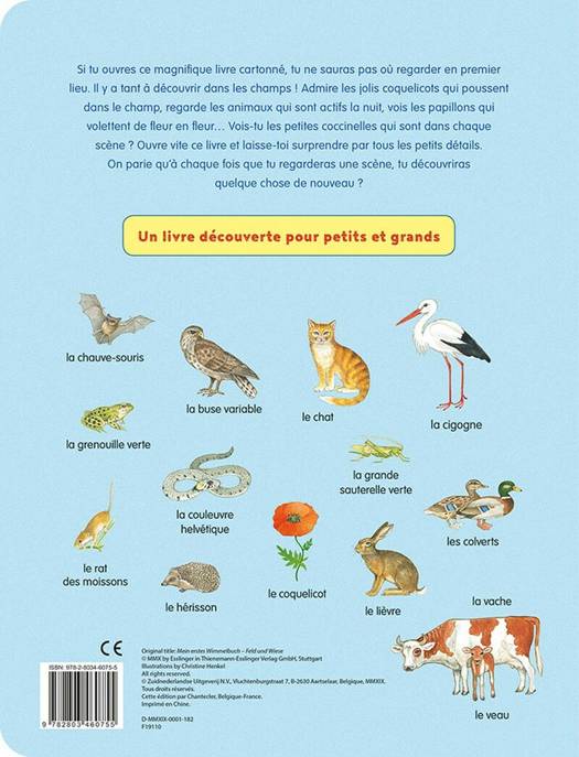 Un livre découverte pour petits et grands ! Si tu ouvres ce magnifique livre cartonné, tu ne sauras pas où regarder en premier lieu. Il y a tant à découvrir dans les champs ! Admire les jolis coquelicots qui poussent dans le champ, regarde les animaux qui sont actifs la nuit, vois les papillons qui volettent de fleur en fleur… Vois-tu les petites coccinelles qui sont dans chaque scène ? Ouvre vite ce livre et laisse-toi surprendre par tous les petits détails. On parie qu'à chaque fois que tu regarderas une scène, tu découvriras quelque chose de nouveau ?