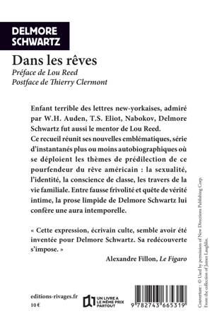 Considéré comme l'un des plus grands poètes et nouvellistes américains, Delmore Schwartz fait partie de ces légendes dont est peuplée l'histoire littéraire, qui passent au gré des époques de l'ombre à la lumière. Acclamé dès ses premiers écrits en 1937, traducteur à vingt-six ans d'"Une saison en enfer", admiré par Auden, T.S. Eliot, Nabokov, ami proche de Saul Bellow, il fut aussi le mentor de Lou Reed, qui lui dédie plusieurs chansons. "Dans les rêves" réunit ses nouvelles les plus emblématiques, série d'instantanés plus ou moins autobiographiques d'un gamin de Brooklyn, fils d'émigrés juifs. Mélange subtil de drame et d'humour, d'absurdité et de quête de vérité intime, l'écriture singulière de Delmore Schwartz conserve aujourd'hui toute son aura.