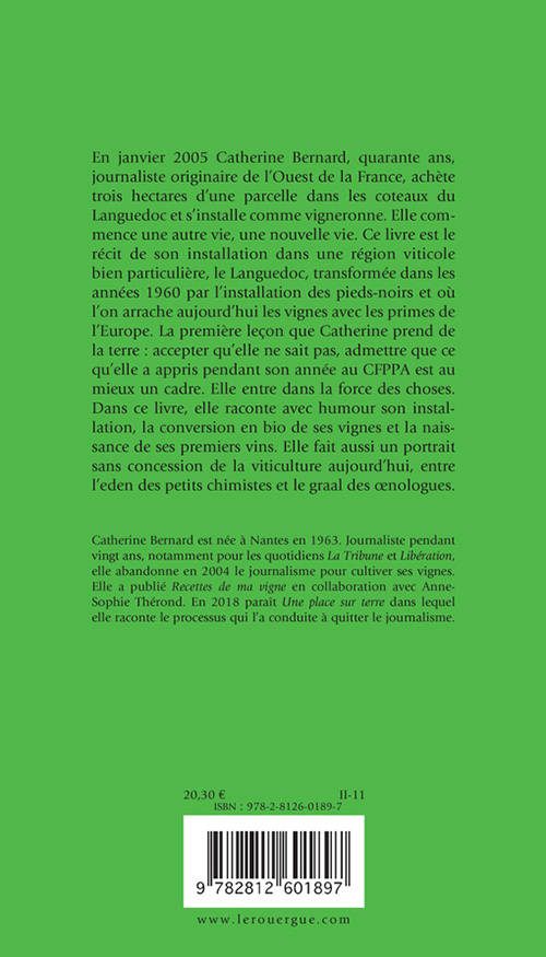 A 40 ans, Catherine Bernard, ci-devant correspondante de La Tribune de l'Économie et de Libération à Montpellier, passe un BPA de viticulture-oenologie. Depuis, elle cultive 3,60 hectares de vignes en Languedoc-Roussillon et fait du vin. Dans ce livre, elle raconte avec humour son installation, la conversion en bio de ses vignes et la naissance de ses premiers vins. Elle fait aussi un portrait sans concession de la viticulture aujourd'hui, entre l'éden des petits chimistes et le graal des oenologues diplômés.