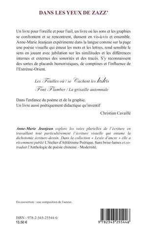 Un livre pour l’oreille et pour l’oeil, un livre où les sons et les graphies se confrontent et se rencontrent, dansent en vis-à-vis et ensemble. Anne-Marie Jeanjean expérimente dans la langue comme sur la page une poésie visuelle qui émeut les mots et les lettres, rend sensible le sens en jouant avec jubilation sur les similitudes et les différences internes et externes des sonorités et des tracés. S’y reconnaissent des sortes de placards humoristiques, de comptines et l’influence de l’Extrême-Orient. Dans l’enfance du poème et de la graphie. Un livre aussi poétiquement didactique qu’inventif. Christian Cavaillé