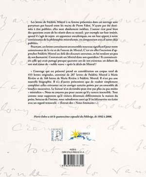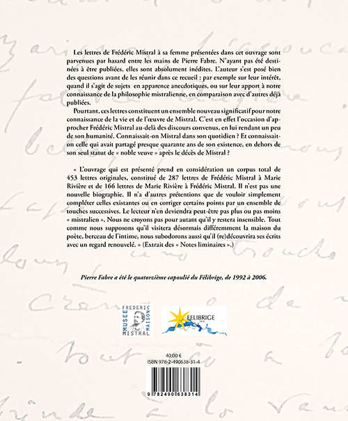 Les lettres de Frédéric Mistral à sa femme présentées dans cet ouvrage sont parvenues par hasard entre les mains de Pierre Fabre. N’ayant pas été destinées à être publiées, elles sont absolument inédites. L’auteur s’est posé bien des questions avant de les réunir dans ce recueil : par exemple sur leur intérêt, quand il s’agit de sujets en apparence anecdotiques, ou sur leur apport à notre connaissance de la philosophie mistralienne, en comparaison avec d’autres déjà publiées. Pourtant, ces lettres constituent un ensemble nouveau significatif pour notre connaissance de la vie et de l’œuvre de Mistral. C’est en effet l’occasion d’approcher Frédéric Mistral au-delà des discours convenus, en lui rendant un peu de son humanité. Connaissait-on Mistral dans son quotidien ? Et connaissait-on celle qui avait partagé presque quarante ans de son existence, en dehors de son seul statut de « noble veuve » après le décès de Mistral ?