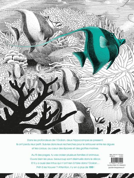 Deux hippocampes ont perdu leur petit... Suis-les au fond de l’océan, où vivent toutes sortes d’animaux marins. Beaucoup sont cachés dans le décor... et certains intrus n’ont pas leur place sous la mer. Prêts à les trouver ? De l’étoile de mer à la baleine, il y a 100 animaux cachés.