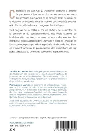 Chaque période de crise est porteuse de mutations, de changements. Tenter de les repérer, c'est se donner les moyens de ressentir les lignes de force du monde en devenir. Qu'il s'agisse de la politique par les chiffres, de la montée de la défiance et du conspirationnisme, des effets culturels de la distanciation sociale..., à partir de l'ancrage de l'anthropologie politique, les débats abordés dans l'ouvrage aident à garder la tête hors de l'eau et prémunissent des explications simplistes.