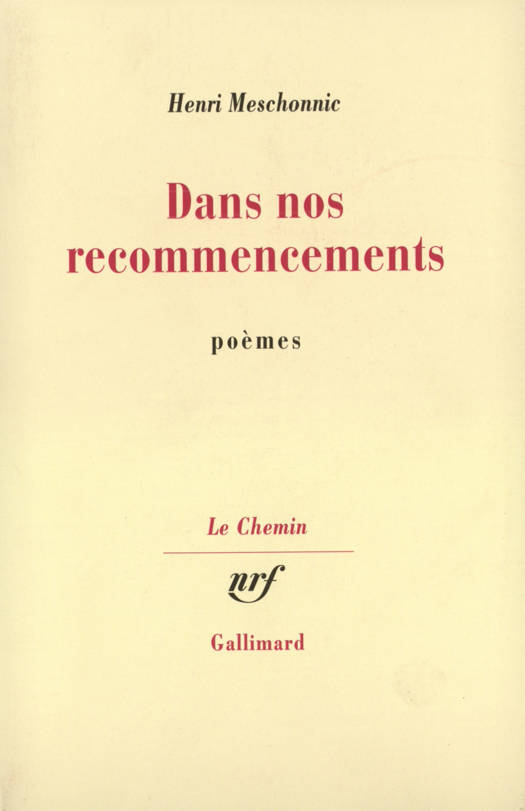 Ce recueil de poèmes est composé de trois parties : Ce qui se dit avant, Dans nos recommencements, Je tourne vers notre année. Il est précédé d'une courte préface où l'auteur répond à ceux de ses lecteurs qui s'étonnent d'un apparent écart entre un art poétique savant qui est celui exprimé par Meschonnic dans ses essais, et la complète simplicité de ses poèmes. Le théoricien méticuleux qu'est Henri Meschonnic ne craint pas de montrer qu'il se soucie avant tout de la vie et qu'il veut s'adresser à tous.