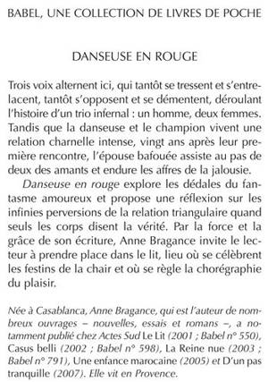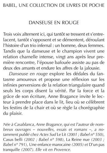 Trois voix alternent ici, qui tantôt se tressent et s'entrelacent, tantôt s'opposent et se démentent, déroulant l'histoire d'un trio infernal : un homme, deux femmes. Tandis que la danseuse et le champion vivent une relation charnelle intense, vingt ans après leur première rencontre, l'épouse bafouée assiste au pas de deux des amants et endure les affres de la jalousie. Danseuse en rouge explore les dédales du fantasme amoureux et propose une réflexion sur les infinies perversions de la relation triangulaire quand seuls les corps disent la vérité. Par la force et la grâce de son écriture, Anne Bragance invite le lecteur à prendre place dans le lit, lieu où se célèbrent les festins de la chair et où se règle la chorégraphie du plaisir.