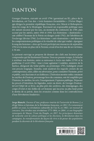 Le présent ouvrage se propose de donner des clefs aux lecteurs pour comprendre quel fut finalement Danton. Dans un premier temps, il s’attache à restituer son histoire, entre la naissance à Arcis-sur-Aube (1759) et la guillotine (5 avril 1794) : tour à tour agitateur Cordelier, ministre de la Justice, dirigeant du Salut public au printemps 1793, Indulgent avant son procès tragique. Ensuite, sont analysés les regards croisés de ses contemporains, amis, alliés ou adversaires, pour connaître l’homme, privé et public, son charisme et ses faiblesses. L’historien montre enfin comment les mythes de Danton, personnage hors du commun, ont été amplifiés par l’histoire, les médias, les arts, l’enseignement, l’opinion publique. Dépasser les procès d’intention, les légendes, noire ou dorée, de Georges Danton : tel est l’objet de ce livre, au plus près des archives, des témoignages, des coups d’éclat et des failles de cet homme, Danton, qui incarna au plus haut point le destin de sa patrie, dans les avancées comme dans les contradictions d’une Révolution fondatrice.