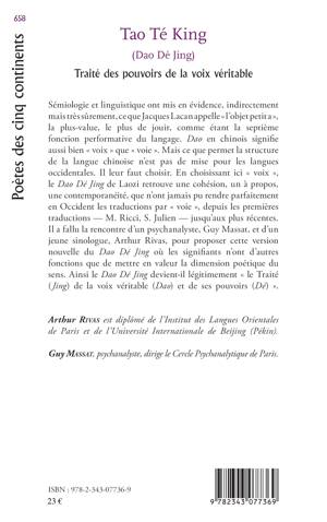 Sémiologie et linguistique ont mis en évidence, indirectement mais très sûrement, ce que Jacques Lacan appelle "l'objet petit a", la plus-value, le plus de jouir, comme étant la septième fonction performative du langage. Dao en chinois signifie aussi bien "voix" que "voie". Mais ce que permet la structure de la langue chinoise n'est pas de mise pour les langues occidentales. Il a fallu la rencontre d'un psychanalyste, Guy Massat, et d'un jeune sinologue, Arthur Rivas, pour proposer cette version nouvelle du Dao Dé Jing où les signifiants n'ont d'autres fonctions que de mettre en valeur la dimension poétique du sens.