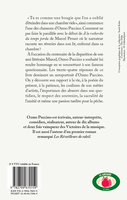 À l’occasion du centenaire de la disparition de son ami littéraire Marcel, Oxmo Puccino a souhaité lui rendre hommage en se soumettant à son fameux questionnaire. Les trente-quatre réponses de ce livre dessinent un autoportrait d’Oxmo Puccino.