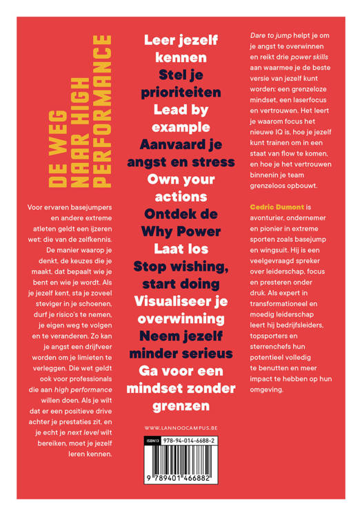 Voor ervaren basejumpers en andere extreme atleten geldt een ijzeren wet: die van de zelfkennis. De manier waarop je denkt, de keuzes die je maakt, dat bepaalt wie je bent en wie je wordt. Als je jezelf kent, sta je zoveel steviger in je schoenen, durf je risico's te nemen, je eigen weg te volgen en te veranderen. Zo kan je angst een drijfveer worden om je limieten te verleggen. Die wet geldt ook voor professionals die aan high performance willen doen. Als je wilt dat er een positieve drive achter je prestaties zit, en je echt je next level wilt bereiken, moet je jezelf leren kennen.