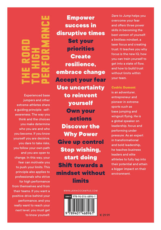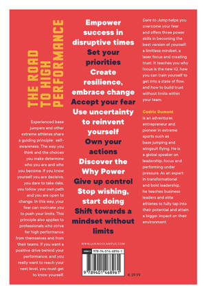 Empower success in disruptive times Set your priorities Create resilience, embrace change Accept your fear Use uncertainty to reinvent yourself Own your actions Discover the Why Power Give up control Stop wishing, start doing Shift towards a mindset without limits Experienced base jumpers and other extreme athletes share a guiding principle: selfawareness. The way you think and the choices you make determine who you are and who you become. If you know yourself you are decisive, you dare to take risks, you follow your own path and you are open to change. In this way, your fear can motivate you to push your limits. This principle also applies to professionals who strive for high performance from themselves and from their teams. If you want a positive drive behind your performance, and you really want to reach your next level, you must get to know yourself. Dare to Jump helps you overcome your fear and offers three power skills in becoming the best version of yourself: a limitless mindset, a laser focus and creating trust. It teaches you why focus is the new IQ, how you can train yourself to get into a state of flow, and how to build trust without limits within your team.