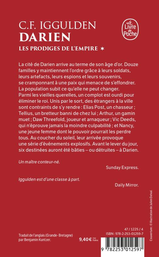 La cité de Darien arrive au terme de son âge d’or. Douze familles y maintiennent l’ordre grâce à leurs soldats, leurs artefacts, leurs espions et leurs souvenirs, se cramponnant à une paix qui menace de s’effondrer. La population subit ce qu’elle ne peut changer. Parmi les vieilles querelles, un complot est ourdi pour éliminer un roi. Unis par le sort, des étrangers à la ville sont contraints de s’y rendre : Elias Post, un chasseur ; Tellius, un bretteur banni de chez lui ; Arthur, un garçon muet ; Daw Threefold, joueur et arnaqueur ; Vic Deeds, qui n’éprouve jamais la moindre culpabilité ; et Nancy, une jeune femme dont le pouvoir pourrait les perdre tous. Au coucher du soleil, leur entrée dans la ville provoque une série d’événements explosifs. Avant le lever du jour, six destinées auront été bâties - ou détruites - à Darien.