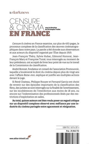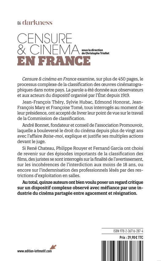 Sixième volume de la collection Darkness consacrée à la censure au cinéma. Censure & cinéma en France examine sur plus de 450 pages, le processus complexe de la classification des œuvres cinématographiques dans notre pays. La parole a été donnée aux observateurs et aux acteurs du dispositif organisé par l’État depuis 1919. Jean-François Théry, Sylvie Hubac, Edmond Honorat, Jean-François Mary et Françoise Tomé, tous interrogés au moment de leur présidence, ont accepté de livrer leur point de vue sur le travail de la Commission de classification. André Bonnet, fondateur et conseil de l’association Promouvoir, laquelle a bouleversé le droit du cinéma depuis plus de vingt ans avec l’affaire Baise-moi, explique et justifie ses multiples actions devant le juge. Si René Chateau, Philippe Rouyer et Fernand Garcia ont choisi de revenir sur des épisodes importants de la classification des films, des juristes se sont interrogés sur la finalité de l’avertissement, sur les incohérences de l’interdiction aux moins de 18 ans, ou encore sur l’indemnisation des professionnels lésés par des restrictions d’exploitation en salles. Au total, quinze auteurs ont bien voulu poser un regard critique sur un dispositif complexe observé avec méfiance par une industrie du cinéma partagée entre agacement et résignation.