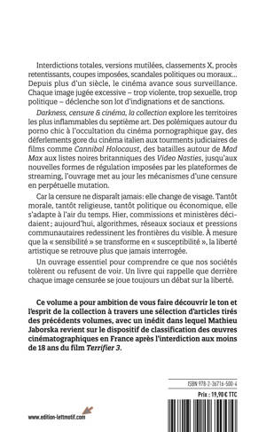 Darkness, censure & cinéma, la collection explore les territoires les plus inflammables du septième art. Des polémiques autour du porno chic à l’occultation du cinéma pornographique gay, des déferlements gore du cinéma italien aux tourments judiciaires de films comme Cannibal Holocaust, des batailles autour de Mad Max aux listes noires britanniques des Video Nasties, jusqu’aux nouvelles formes de régulation imposées par les plateformes de streaming, l’ouvrage met au jour les mécanismes d’une censure en perpétuelle mutation.