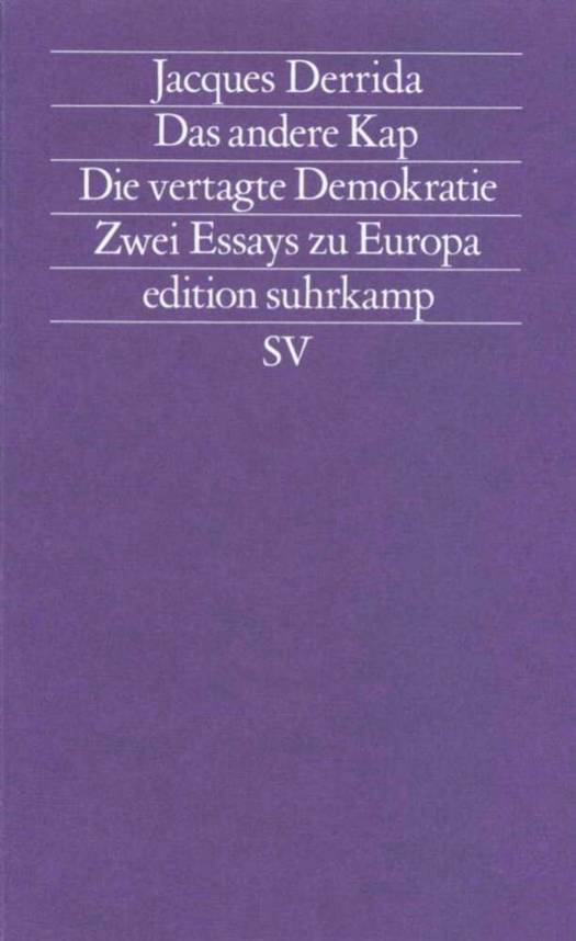 Der Band vereinigt zwei politische Texte Derridas: »Das andere Kap« und »Die vertagte Demokratie«. Im ersten geht es um die Identität Europas heute. Auf der einen Seite gibt es untrügliche Anzeichen, daß der nostalgische Traum eines glorreichen, beherrschenden Europas als der Kapitale der Welt wiederauflebt; auf der anderen Seite ist klar, daß unsere Zukunft als Europäer nur in der Differenzierung von dieser Vergangenheit liegen kann. In dieser Aporie, ihren Spannungen und Divergenzen, ist, so Derrida, Europas künftige Identität begründet. »Die vertagte Demokratie« läßt sich als eine am Verhältnis von öffentlicher Meinung und Medien abgehandelte Konkretisierung dieses Programms lesen: Unter welchen Bedingungen ist eine wirkliche »öffentlichkeit« im Sinne der Aufklärung möglich?