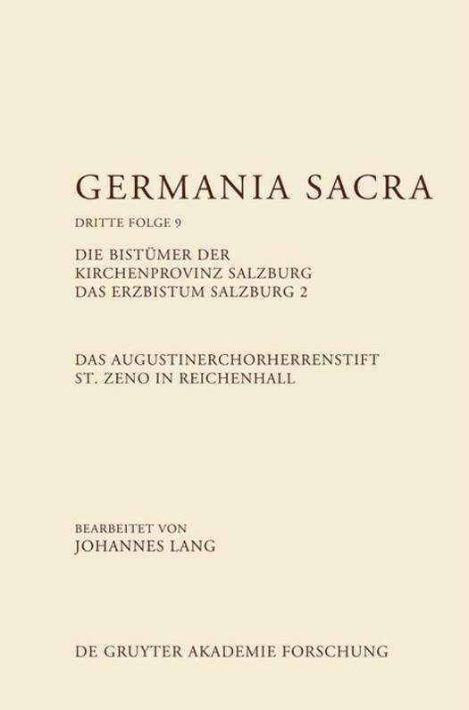 Im zweiten Band der Germania Sacra zum Erzbistum Salzburg behandelt Johannes Lang das 1136 gegründete Augustiner-Chorherrenstift St. Zeno in Reichenhall bis zu seiner Aufhebung 1803. Als einzige eigenständige Gründung des Salzburger Erzbischofs Konrad von Abenberg besaß das Kloster zunächst eine wichtige politische Funktion als Brückenkopf der Salzburger Kirche in der wirtschaftlich wichtigen Salinenstadt Reichenhall. Ab dem Spätmittelalter erlangte das Stift, der Ausrichtung des Ordens gemäß, nicht nur für die unmittelbare Bevölkerung, sondern auch für weiter entfernte Gebiete eine starke seelsorgliche Bedeutung. Gleichzeitig entwickelte sich St. Zeno zum geistlichen, geistigen und kulturellen Zentrum der gesamten Region. Analog zu den inkorporierten Pfarreien erstreckte sich der Grundbesitz des Chorherrenstifts auf bayerisches, salzburgisches, tirolisches und österreichisches Gebiet. Gleichwohl schöpfte das Kloster seinen größten Reichtum aus der eigenen Salzproduktion, die bis zum Jahre 1616 aufrechterhalten wurde. Der abschließende Katalog behandelt die Pröpste und die zeitweilig große Zahl von Konventualen, die auch in den auswärtigen Pfarreien eingesetzt waren.