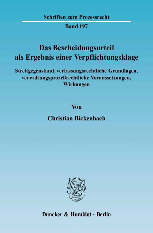 Das Bescheidungsurteil ist in einer Zeit, in der die tatsächlichen und rechtlichen Voraussetzungen von Ansprüchen der Bürger gegen den Staat zunehmend schwieriger zu ermitteln und zu bewerten sind, eine in der gerichtlichen Praxis immer wichtigere Urteilsform, deren Grundlagen, Voraussetzungen und Wirkungen bis heute nicht ausreichend erforscht sind.