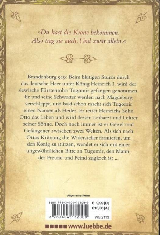 Brandenburg 929: Beim blutigen Sturm durch das deutsche Heer unter König Heinrich I. wird der slawische Fürstensohn Tugomir gefangen genommen. Er und seine Schwester werden nach Magdeburg verschleppt, und bald schon macht sich Tugomir einen Namen als Heiler. Er rettet Heinrichs Sohn Otto das Leben und wird dessen Leibarzt und Lehrer seiner Söhne. Doch noch immer ist er Geisel und Gefangener zwischen zwei Welten. Als sich nach Ottos Krönung die Widersacher formieren, um den König zu stürzen, wendet er sich mit einer ungewöhnlichen Bitte an Tugomir, den Mann, der Freund und Feind zugleich ist ...