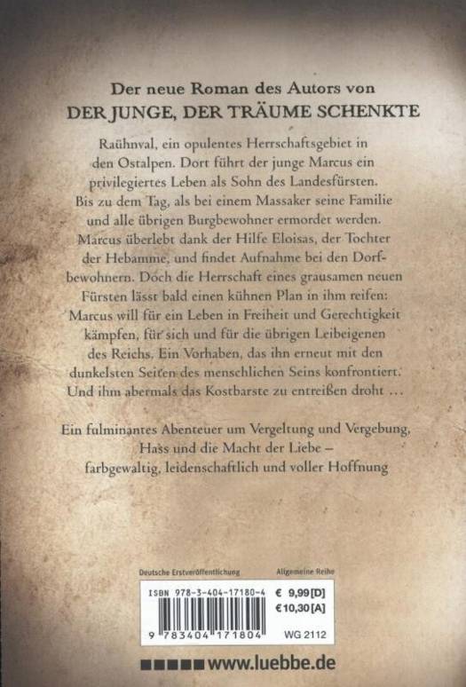 DER NEUE ROMAN VON BESTSELLERAUTOR LUCA DI FULVIO. Raühnval, ein opulentes Herrschaftsgebiet in den Ostalpen. Der junge Marcus lebt ein privilegiertes Leben als Sohn des Landesfürsten. Elisa ist die Tochter der Dorfhebamme und weiß, was Entbehrung heißt. Bei einem Massaker werden Marcus' Familie und alle übrigen Burgbewohner ermordet. Dank Elisas Hilfe bleibt Marcus unentdeckt und findet mit einer neuen Identität Aufnahme bei den Dorfbewohnern. Doch er spürt schon bald, dass ihm ein anderes Schicksal vorherbestimmt ist: Sein Herz brennt für Freiheit und Gerechtigkeit...