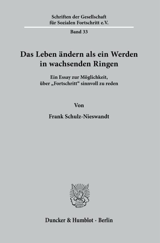 English summary: Changing Life as a Becoming in Growing Rings. An Essay on the Possibility of Talking about Progress in a Meaningful Way The interdisciplinary treatise is about a philosophy of law and ethics of determining of understanding of progress. The basis is a personalistic anthropology. The search for the true form of man takes place in a modallogical understanding of history. It is about the interplay of ontological truth and empirical science. At the same time it is a contribution to the reformulation of a critical theory on the basis of a metaphysics of natural law. German description: In der interdisziplinaren Abhandlung geht es um eine Rechtsphilosophie und Ethik der Bestimmung des Verstandnisses von Fortschritt. Im Zentrum steht das Problem der Selbsttranszendenz des Menschen in seinem Weltverhaltnis in Oikos, Polis und Kosmos. Grundlage ist eine personalistische Anthropologie. Die Suche nach der wahren Form des Menschen spielt sich in einem modallogischen Verstandnis von Geschichte ab. Es geht um das Zusammenspiel ontologischer Wahrheit als Ausdrucksgestaltlehre und praxeologischer Erfahrungswissenschaft. Der Blick richtet sich auf die Uberwindung der Entfremdung des responsiven Subjekts als transzendentale Obdachlosigkeit des Menschen. Zugleich ist es ein Beitrag zur Reformulierung einer Kritischen Theorie auf der Grundlage einer Metaphysik des uberpositiven Naturrechts der personalen Wurde und der genossenschaftlichen Form der Miteinanderfreiheit in Miteinanderverantwortung.