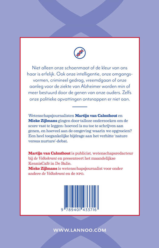 Het meest ambitieuze onderzoek naar de erfelijkheid van menselijke trekjes Niet alleen onze schoenmaat of de kleur van ons haar is erfelijk. Ook onze intelligentie, onze omgangsvormen, crimineel gedrag, vreemdgaan of onze aanleg voor de ziekte van Alzheimer worden min of meer bestuurd door de genen van onze ouders. Zelfs onze politieke opvattingen ontsnappen er niet aan. Wetenschapsjournalisten Martijn van Calmthout en Mieke Zijlmans gingen door talloze onderzoeken om de score vast te leggen: hoeveel is nu toe te schrijven aan genen, en hoeveel aan de omgeving waarin we opgroeien? Een heel toegankelijke bijdrage aan het verhitte 'nature versus nurture'-debat.