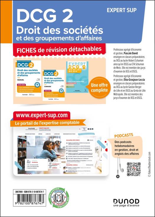 Des fiches détachables 100 % conformes au programme de DCG et aux guides pédagogiques, les fiches de révision Dunod sont détachables pour des utilisations variées (glissées dans le manuel, en complément du cours du professeur, à emporter partout…). Les fiches de révision offrent : – l’essentiel du cours (définitions, exemples, mini-cas chiffrés, etc.) ; – les compétences et savoirs associés ; – des synthèses visuelles (schémas, tableaux, phrases à retenir…) pour une mémorisation facilitée ; – les conseils des auteurs, membres des jurys d’examen (« Le + de l’expert »).