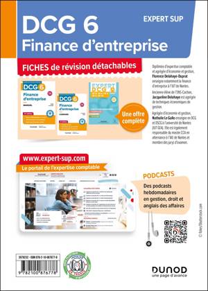 Des fiches détachables 100 % conformes au programme et conformes au PCG en vigueur 100 % conformes au programme de DCG et aux guides pédagogiques, les fiches de révision Dunod sont détachables pour des utilisations variées (glissées dans le manuel, en complément du cours du professeur, à emporter partout…). Les fiches de révision offrent : – l’essentiel du cours (définitions, exemples, mini-cas chiffrés, etc.) ; – les compétences et savoirs associés ; – des synthèses visuelles (schémas, tableaux, phrases à retenir…) pour une mémorisation facilitée ; – les conseils des auteurs, membres des jurys d’examen (« Le + de l’expert »).