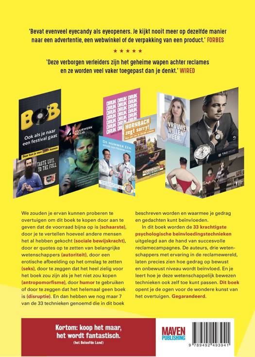 We zouden je ervan kunnen proberen te overtuigen om dit boek te kopen door aan te geven dat de voorraad bijna op is (schaarste), door je te vertellen hoeveel andere mensen het al hebben gekocht (sociale bewijskracht), door er quotes op te zetten van belangrijke wetenschappers (autoriteit), door een erotische afbeelding op het omslag te zetten (seks), door te zeggen dat het heel zielig voor het boek zou zijn als je het niet zou kopen (antropomorfisme), door humor te gebruiken of door te zeggen dat het helemaal geen boek is (disruptie). En dan hebben we nog maar 7 van de 33 technieken genoemd die in dit boek beschreven worden en waarmee je gedrag en gedachten kunt beïnvloeden.