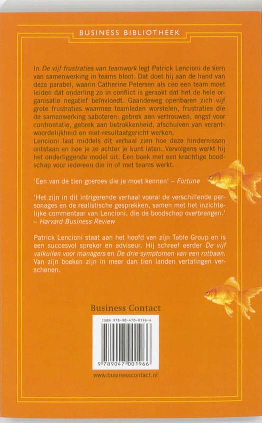 In De vijf frustraties van teamwork legt Patrick Lencioni de kern van samenwerking in teams bloot. Dat doet hij aan de hand van deze parabel, waarin Catherine Petersen als ceo een team moet leiden dat onderling zo in conflict is geraakt dat het de hele organisatie negatief beïnvloedt. Gaandeweg openbaren zich vijf grote frustraties waarmee teamleden worstelen, frustraties die de samenwerking saboteren: gebrek aan betrokkenheid, afschuiven van verantwoordelijkheid en niet-resultaatgericht werken. Lencioni laat middels dit verhaal zien hoe deze hindernissen ontstaan en hoe je ze achter je kunt laten. Vervolgens werkt hij het onderliggende model uit. Een boek met een krachtige boodschap voor iedereen die in of met teams werkt.