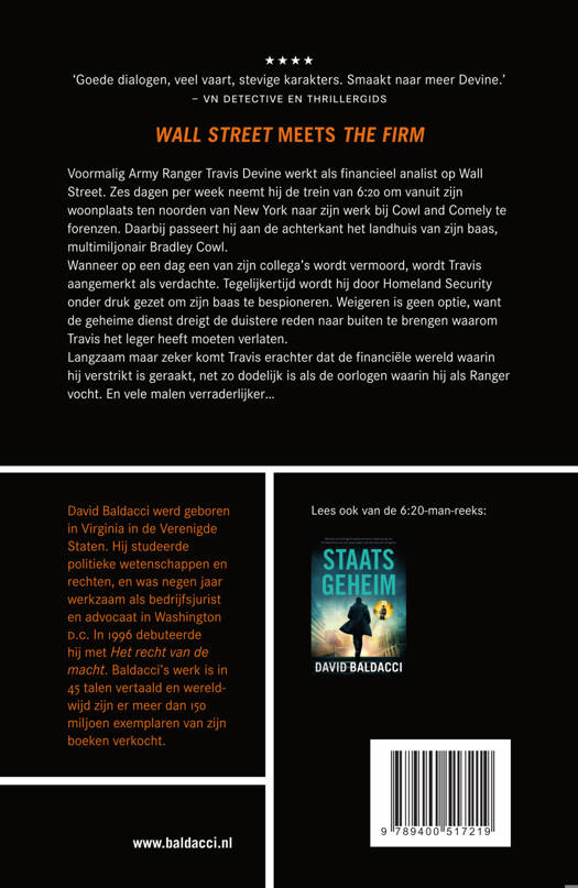 Wanneer op een dag een van zijn collega’s wordt vermoord, wordt Travis aangemerkt als verdachte. Tegelijkertijd wordt hij door Homeland Security onder druk gezet om zijn baas, multimiljonair Bradley Cowl, te bespioneren. Weigeren is geen optie, want de geheime dienst dreigt de duistere reden naar buiten te brengen waarom Travis het leger heeft moeten verlaten. Langzaam maar zeker komt Travis erachter dat de financiële wereld waarin hij verstrikt is geraakt, net zo dodelijk is als de oorlogen waarin hij als Ranger vocht. En veel verraderlijker…
