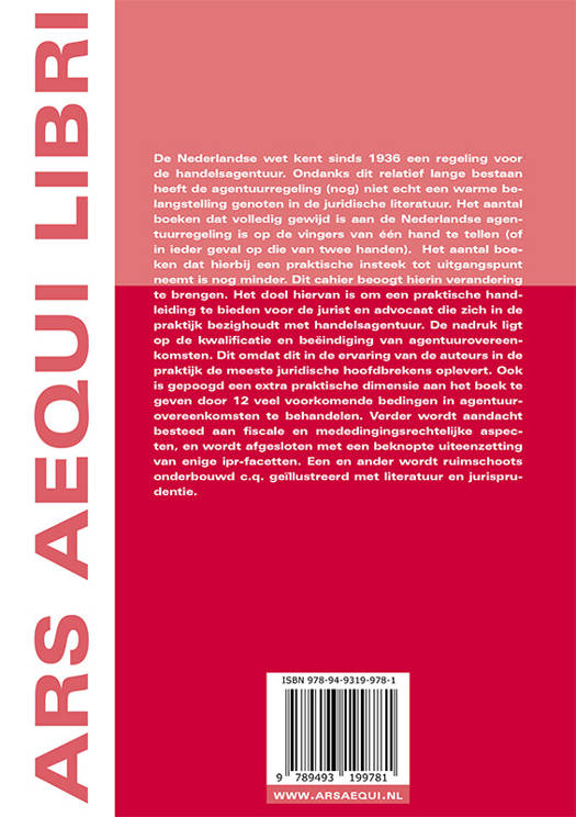 De Nederlandse wet kent sinds 1936 een regeling voor de handelsagentuur. Ondanks dit relatief lange bestaan heeft de agentuurregeling (nog) niet echt een warme belangstelling genoten in de juridische literatuur. Het aantal boeken dat volledig gewijd is aan de Nederlandse agentuurregeling is op de vingers van één hand te tellen (of in ieder geval op die van twee handen). Het aantal boeken dat hierbij een praktische insteek tot uitgangspunt neemt is nog minder. Dit cahier beoogt hierin verandering te brengen. Het doel hiervan is om een praktische handleiding te bieden voor de jurist en advocaat die zich in de praktijk bezighoudt met handelsagentuur. De nadruk ligt op de kwalificatie en beëindiging van agentuurovereenkomsten. Dit omdat dit in de ervaring van de auteurs in de praktijk de meeste juridische hoofdbrekens oplevert. Ook is gepoogd een extra praktische dimensie aan het boek te geven door 12 veel voorkomende bedingen in agentuurovereenkomsten te behandelen. Verder wordt aandacht besteed aan fiscale en mededingingsrechtelijke aspecten, en wordt afgesloten met een beknopte uiteenzetting van enige ipr-facetten. Een en ander wordt ruimschoots onderbouwd c.q. geïllustreerd met literatuur en jurisprudentie.
