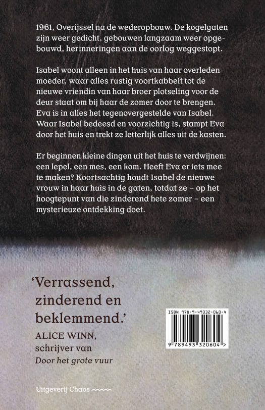 Maar dan beginnen er kleine dingen – een lepel, een mes, een kom – uit het huis te verdwijnen. Heeft Eva er iets mee te maken? Dat idee laat Isabel niet los. Koortsachtig houdt ze de nieuwe vrouw in de gaten, totdat ze – op het hoogtepunt van die zinderend hete zomer – een mysterieuze ontdekking doet waardoor netjes afgedekte geheimen haar plotseling keihard in het gezicht slaan. Misschien is de oorlog niet helemaal voorbij.