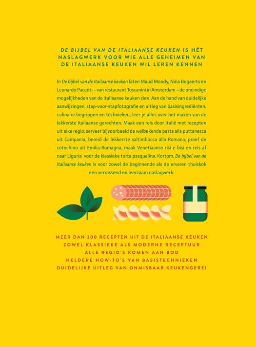 In De bijbel van de Italiaanse keuken laten Maud Moody, Nina Bogaerts en Leonardo Pacenti - van restaurant Toscanini in Amsterdam - de oneindige mogelijkheden van de Italiaanse keuken zien. Aan de hand van duidelijke aanwijzingen, stap-voor-stapfotografie en uitleg van basisingrediënten, culinaire begrippen en technieken, leer je alles over het maken van de lekkerste Italiaanse gerechten. Maak een reis door Italië met recepten uit elke regio: serveer bijvoorbeeld de welbekende pasta alla puttanesca uit Campania, bereid de lekkerste saltimbocca alla Romana, of reis af naar het noordwesten van Italië voor de klassieke torta pasqualina. Kortom, De bijbel van de Italiaanse keuken is voor zowel de beginnende als de ervaren thuiskok een verrassend en leerzaam naslagwerk.