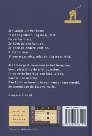 Als Tessa gaat zwemmen in het bergmeer, komt plotseling de mist opzetten. In de verte hoort ze een klok luiden. Daar wil ze naartoe. Dan komt ze terecht in een heel andere wereld. De wereld van de Blauwe Marie. Maar wie is toch die Blauwe Marie? En waarom wil niemand Tessa geloven? Ze heeft het immers zelf meegemaakt, dus ... Een geheimzinnig, sprookjesachtig verhaal, prachtig geillustreerd door Helen van Vliet.