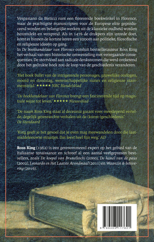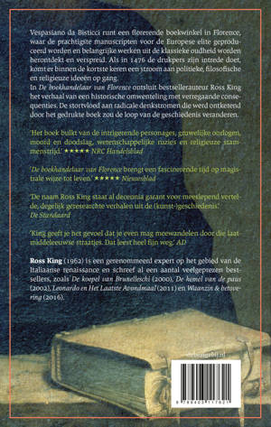 In De boekhandelaar van Florence ontsluit bestsellerauteur Ross King het verhaal van een lokale strijd met verregaande consequenties. De stortvloed aan radicale denkstromen die werd ontketend door het gedrukte boek zou de loop van de geschiedenis veranderen; de drukpers vormde de voedingsbodem voor de renaissance en de reformatie, en maakte het pad vrij voor de verlichting – en voor de moderne wereld zoals we die nu kennen.