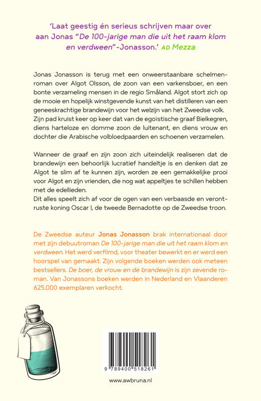 Jonas Jonasson is terug met een onweerstaanbare schelmenroman over Algot Olsson, de zoon van een varkensboer, en een bonte verzameling mensen in de regio Småland in Värend, die zich stort op de mooie en hopelijk lucratieve kunst van het distilleren van brandewijn voor het welzijn van het Zweedse volk.