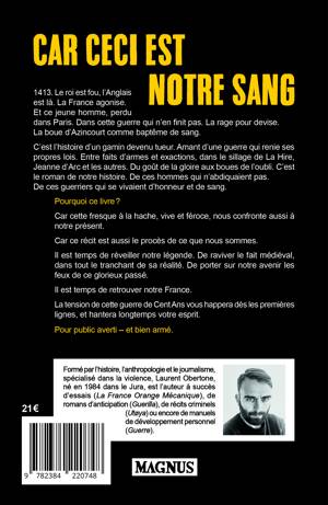 C’est l’histoire d’un gamin devenu tueur. Amant d’une guerre qui renie ses propres lois. Entre faits d’armes et exactions, dans le sillage de La Hire, Jeanne d’Arc et les autres. Du goût de la gloire aux boues de l’oubli. C’est le roman de notre histoire. De ces hommes qui n’abdiquaient pas.