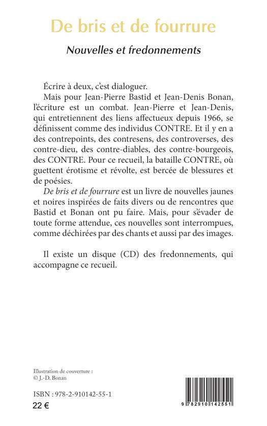 Écrire à deux, c’est dialoguer. Mais pour Jean-Pierre Bastid et Jean-Denis Bonan, l’écriture est un combat. Jean-Pierre et Jean-Denis, qui entretiennent des liens affectueux, se définissent comme des individus CONTRE. Et il y en a des contrepoints, des contresens, des contre-dieu, des contre-diables, des contre-bourgeois, des CONTRE. Pour ce recueil, la bataille CONTRE, où guettent érotisme et révolte, est bercée de blessures et de poésies. De bris et de fourrure est un livre de nouvelles inspirées de faits divers ou de rencontres que les auteurs ont pu faire. Mais, pour s’évader de toute forme attendue, ces nouvelles sont interrompues, comme déchirées par des chants et aussi par des images. Il existe un disque (CD) des fredonnements, qui accompagne ce recueil.