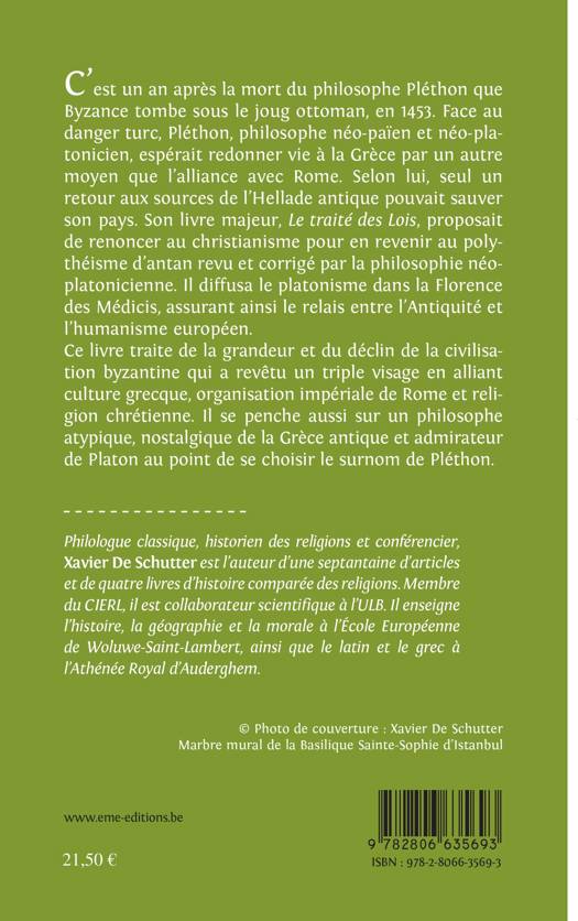 Byzance, menacée depuis deux siècles par les Ottomans, tombe en 1453, un an après la mort du philosophe Pléthon. Ce livre traite de la grandeur et du déclin de la civilisation byzantine qui a revêtu un triple visage en alliant culture grecque, organisation impériale de Rome et religion chrétienne. Il y est question des relations difficiles entre l'orthodoxie grecque et le catholicisme romain, ainsi que du néo-platonisme que Pléthon a diffusé dans la Florence des Médicis, participant ainsi à l'émergence de l'humanisme européen.