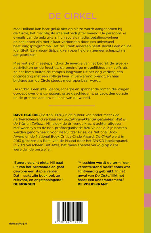 Mae Holland kan haar geluk niet op als ze wordt aangenomen bij de Cirkel, het machtigste internetbedrijf ter wereld. De persoonlijke e-mails van de gebruikers, hun sociale media, betalingsverkeer en aankopen zijn met elkaar verbonden door een universeel besturingsprogramma. Het resultaat: iedereen heeft slechts één online identiteit. Een nieuw tijdperk van openheid en gemeenschapszin is aangebroken. Mae laat zich meeslepen door de energie van het bedrijf, de groepsactiviteiten en de feestjes, de oneindige mogelijkheden – zelfs als ze het leven buiten de campus langzaam uit het oog verliest, een ontmoeting met een collega haar in verwarring brengt, en haar bijdrage aan de Cirkel steeds meer openbaar wordt. De Cirkel is een intelligente, scherpe en spannende roman die vragen oproept over ons geheugen, onze geschiedenis, privacy, democratie en de grenzen aan onze kennis van de wereld.