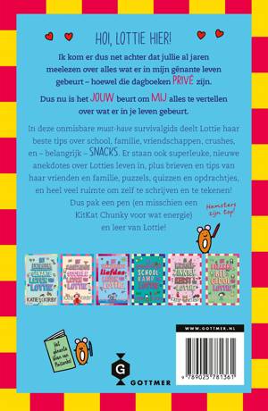 In het boek staan tips en advies van Lottie, spiksplinternieuwe verhalen, superleuke activiteiten, dagboekpagina's van Jess en Amber, en lekker veel ruimte om zelf te schrijven en te tekenen. Dus pak een pen (en misschien een KitKat Chunky voor de nodige energie) en overleef je tienertijd als een pro.
