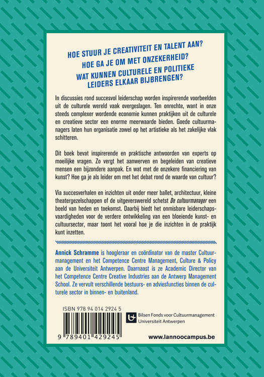 Ook de culturele sector heeft leiderschap nodig Hoe stuur je creativiteit en talent aan? Hoe ga je om met onzekerheid? Wat kunnen culturele en politieke leiders elkaar bijbrengen? In discussies rond succesvol leiderschap worden inspirerende voorbeelden uit de culturele wereld vaak overgeslagen. Ten onrechte, want in onze steeds complexer wordende economie kunnen praktijken uit de culturele en creatieve sector een enorme meerwaarde bieden. Goede cultuurmanagers laten hun organisatie zowel op het artistieke als het zakelijke vlak schitteren. Dit boek bevat inspirerende en praktische antwoorden van experts op moeilijke vragen. Zo vergt het aanwerven en begeleiden van creatieve mensen een bijzondere aanpak. En wat met de onzekere financiering van kunst? Hoe ga je als leider om met het debat rond de waarde van cultuur? Via succesverhalen en inzichten uit onder meer ballet, architectuur, kleine theatergezelschappen of de uitgeverswereld schetst De cultuurmanager een beeld van heden en toekomst. Daarbij biedt het onmisbare leiderschapsvaardigheden voor de verdere ontwikkeling van een bloeiende kunst- en cultuursector, maar toont het vooral hoe je die inzichten in de praktijk kunt inzetten.