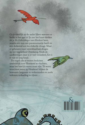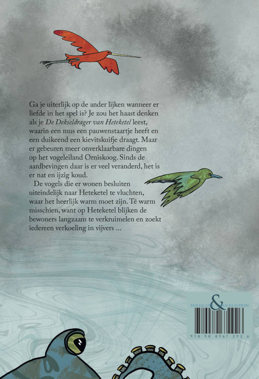Ga je uiterlijk op de ander lijken wanneer er liefde in het spel is? Je zou het haast denken als je 'De Dekseldrager van Heteketel' leest, waarin een mus een pauwenstaartje heeft en een duikeend een kievitskuifje draagt. Maar er gebeuren meer onverklaarbare dingen op het vogeleiland Orniskoog. Sinds de aardbevingen daar is er veel veranderd, het is er nat en ijzig koud. De vogels die er wonen besluiten uiteindelijk naar Heteketel te vluchten, waar het heerlijk warm moet zijn. Té warm misschien, want op Heteketel blijken de bewoners langzaam te verkruimelen en zoekt iedereen verkoeling in vijvers ...