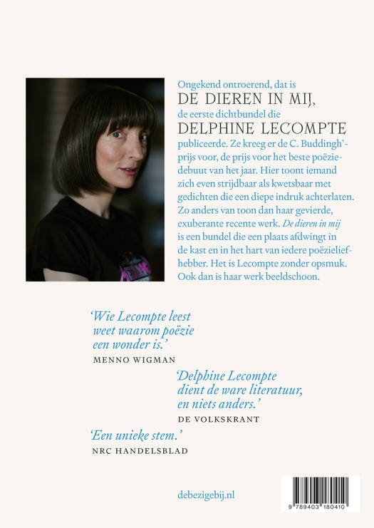 Ongekend ontroerend, dat is De dieren in mij, de eerste dichtbundel van Delphine Lecompte. Ze kreeg er de C. Buddingh’-prijs voor. Hier toonde iemand zich even strijdbaar als kwetsbaar met gedichten die een diepe indruk achterlaten. Zo anders van toon dan haar gevierde, exuberante recente werk. De dieren in mij is een bundel die een plaats afdwingt in de kast en het hart van iedere poëzieliefhebber. Het is Lecompte zonder opsmuk. Ook dan is haar werk beeldschoon.