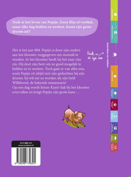 In dit prachtige verhaal voor kinderen vanaf 9 jaar komt geschiedenis echt tot leven. Duik in het leven van Pepijn. Hij leefde in de tijd van ridders en monniken. Het is het jaar 804. Pepijn is door zijn ouders weggegeven aan het klooster. Hij moet monnik worden, vinden ze. Pepijn doet zijn best om zo goed mogelijk te bidden en te werken Toch gaat er van alles mis, want Pepijn zit altijd met zijn gedachten bij zijn droom: hij wil net zo worden als zijn held Willibrordus! Op een dag wordt keizer Karel vlak bij het klooster overvallen en krijgt Pepijn de kans om te laten zien wat hij waard is. Met veel interessante weetjes over deze periode uit de Nederlandse geschiedenis.