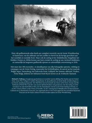 Deze rijk geïllustreerde atlas biedt een compleet overzicht van de Eerste Wereldoorlog in kaartvorm, van de uitbraak van het conflict in Servië tot de hevige gevechten aan het westelijk en oostelijk front. Maar ook de oorlog in het Middellandse Zeegebied, het Midden-Oosten en Afrika komen aan bod, evenals de oorlog op zee, inclusief duikboten, en natuurlijk de langzame geallieerde opmars en uiteindelijke overwinning in 1918. Met meer dan 180 overzichts- en detailkaarten van elke belangrijke operatie, veldslag en campagne van de Grote Oorlog, waaronder het Schlieffenplan, de aanval op het neutrale België, Ieper, Tannenberg, het Galicische front, Gallipoli, het Somme-offensief, Verdun, Vimy Ridge, Jutland, het Italiaanse front bij de Isonzo en de Arabische Opstand.