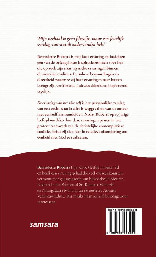 'De ervaring van het niet-zelf' is het persoonlijke verslag van een tocht waarin alles is weggevallen wat de auteur met een zelf kan aanduiden. Nadat Roberts op 15-jarige leeftijd ontdekte hoe deze ervaringen passen in het grotere raamwerk van de christelijke contemplatieve traditie, leefde zij tien jaar in relatieve afzondering om eenheid met God te realiseren.