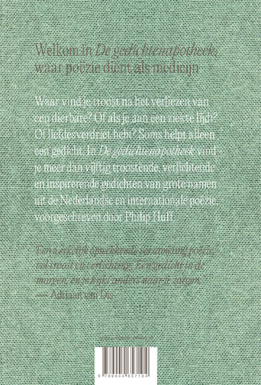 Waar vind je troost na het verliezen van een dierbare? Of als je aan een ziekte lijdt? Of liefdesverdriet hebt? Soms helpt alleen een gedicht. In De gedichtenapotheek vind je meer dan vijftig troostende, verlichtende en inspirerende gedichten van grote namen uit de Nederlandse en internationale poëzie, voorgeschreven door Philip Huff.