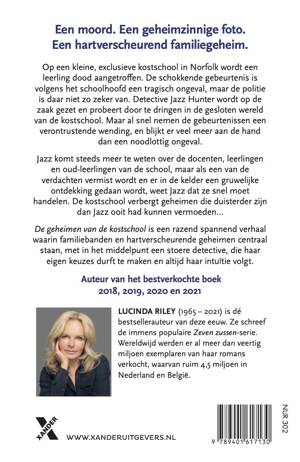 In de spannende roman De geheimen van de kostschool van Lucinda Riley, bekend van de internationale hitserie De zeven zussen wordt op een kleine, exclusieve kostschool in Norfolk een leerling dood aangetroffen. De schokkende gebeurtenis is volgens het schoolhoofd een tragisch ongeval, maar de politie is daar niet zo zeker van. Detective Jazz Hunter wordt op de zaak gezet en probeert door te dringen in de gesloten wereld van de kostschool. Maar al snel nemen de gebeurtenissen een verontrustende wending, en blijkt er veel meer aan de hand dan een noodlottig ongeval.