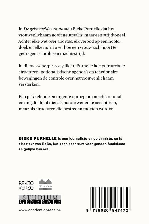 In De geknevelde vrouw stelt Bieke Purnelle dat het vrouwen lichaam nooit neutraal is, maar een strijdtoneel. Achter elke wet over abortus, elk verbod op een hoofddoek en elke norm over hoe een vrouw zich hoort te gedragen, schuilt een machtsstrijd.